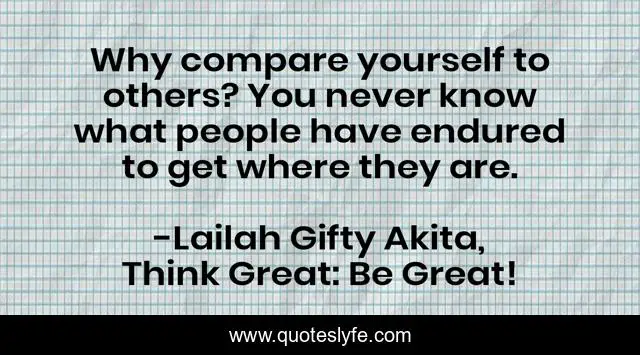 "Lailah Gifty Akita, Think Great: Be Great! Quotes." Quoteslyfe.com, 2025. Fri. 05 Dec. 2025. <https://www.quoteslyfe.com/quote/Why-compare-yourself-to-others-You-never-124046>.