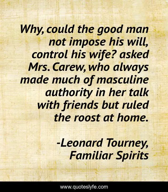 This page presents the quote "Why, could the good man not impose his will, control his wife? asked Mrs. Carew, who always made much of masculine authority in her talk with friends but ruled the roost at home.". Author of this quote is Leonard Tourney, Familiar Spirits. This quote is about marriage, husband, wife,.