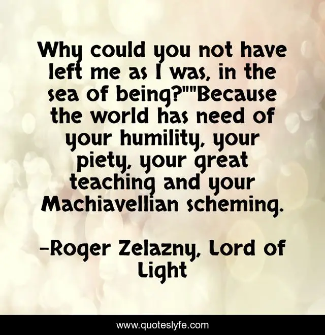 This page presents the quote "Why could you not have left me as I was, in the sea of being?""Because the world has need of your humility, your piety, your great teaching and your Machiavellian scheming.". Author of this quote is Roger Zelazny, Lord of Light. This quote is about politics, sf,.