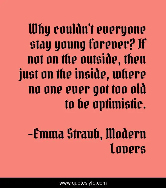 This page presents the quote "Why couldn't everyone stay young forever? If not on the outside, then just on the inside, where no one ever got too old to be optimistic.". Author of this quote is Emma Straub, Modern Lovers. This quote is about aging, optimistic,.