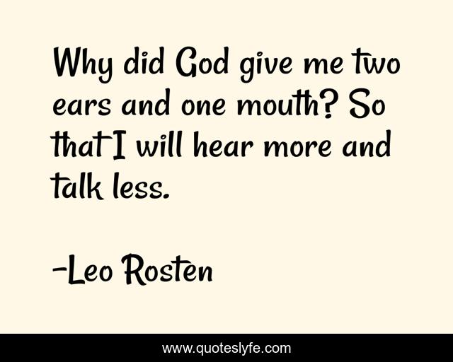 This page presents the quote "Why did God give me two ears and one mouth? So that I will hear more and talk less.". Author of this quote is Leo Rosten. This quote is about me, god, why,.