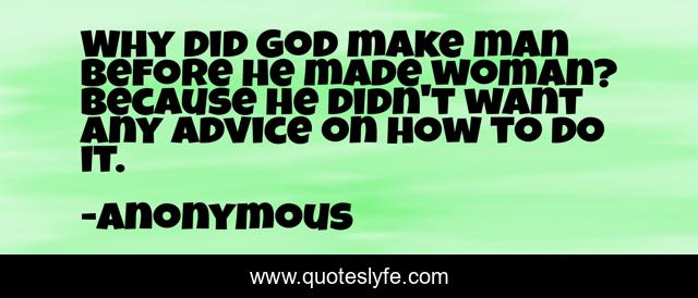 This page presents the quote "Why did God make man before he made woman? Because he didn't want any advice on how to do it.". Author of this quote is Anonymous. This quote is about funny, comedy,.