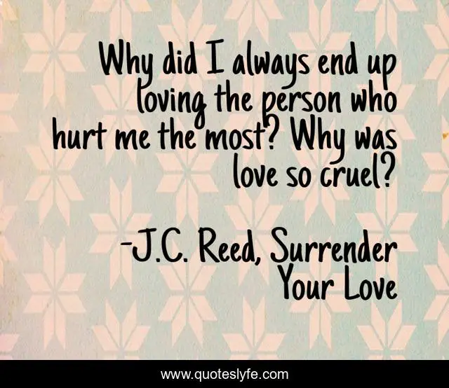 This page presents the quote "Why did I always end up loving the person who hurt me the most? Why was love so cruel?". Author of this quote is J.C. Reed, Surrender Your Love. This quote is about love, seperation, romance, sadness, heartbreak, affection, inspiration,.