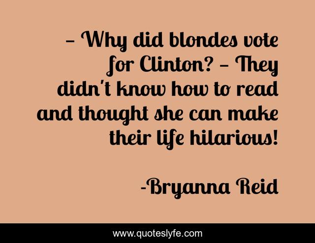 This page presents the quote "— Why did blondes vote for Clinton? — They didn't know how to read and thought she can make their life hilarious!". Author of this quote is Bryanna Reid. This quote is about politics, satire, sarcasm-humor,.
