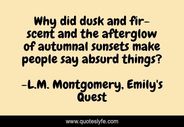 This page presents the quote "Why did dusk and fir-scent and the afterglow of autumnal sunsets make people say absurd things?". Author of this quote is L.M. Montgomery, Emily's Quest. This quote is about love, affection,.