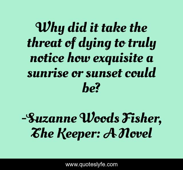 This page presents the quote "Why did it take the threat of dying to truly notice how exquisite a sunrise or sunset could be?". Author of this quote is Suzanne Woods Fisher, The Keeper: A Novel. .