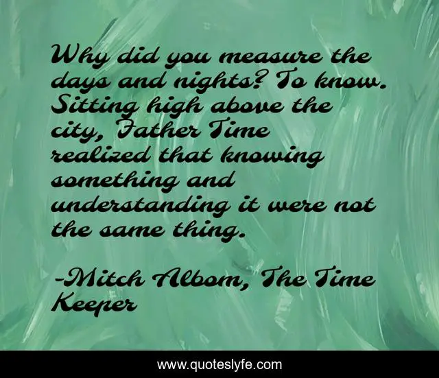 This page presents the quote "Why did you measure the days and nights? To know. Sitting high above the city, Father Time realized that knowing something and understanding it were not the same thing.". Author of this quote is Mitch Albom, The Time Keeper. This quote is about learning, time,.