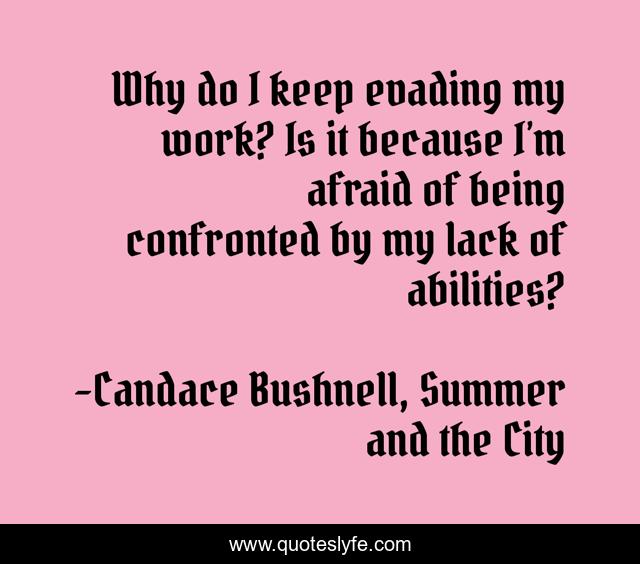This page presents the quote "Why do I keep evading my work? Is it because I’m afraid of being confronted by my lack of abilities?". Author of this quote is Candace Bushnell, Summer and the City. This quote is about writers-block, work, doubt, writing,.