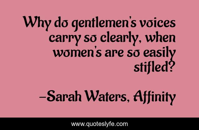 This page presents the quote "Why do gentlemen's voices carry so clearly, when women's are so easily stifled?". Author of this quote is Sarah Waters, Affinity. This quote is about men, voices, women,.