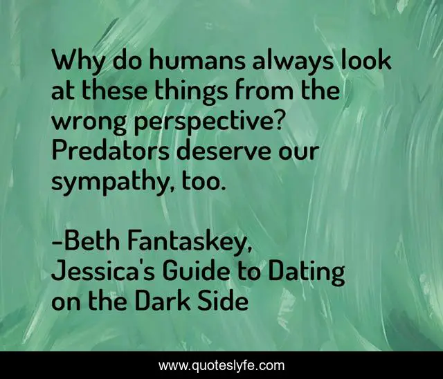 This page presents the quote "Why do humans always look at these things from the wrong perspective? Predators deserve our sympathy, too.". Author of this quote is Beth Fantaskey, Jessica's Guide to Dating on the Dark Side. This quote is about sympathy, predators, human,.