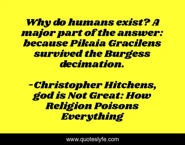 This page presents the quote "Why do humans exist? A major part of the answer: because Pikaia Gracilens survived the Burgess decimation.". Author of this quote is Christopher Hitchens, god is Not Great: How Religion Poisons Everything. This quote is about atheism, atheist, noremorse, god, science,.