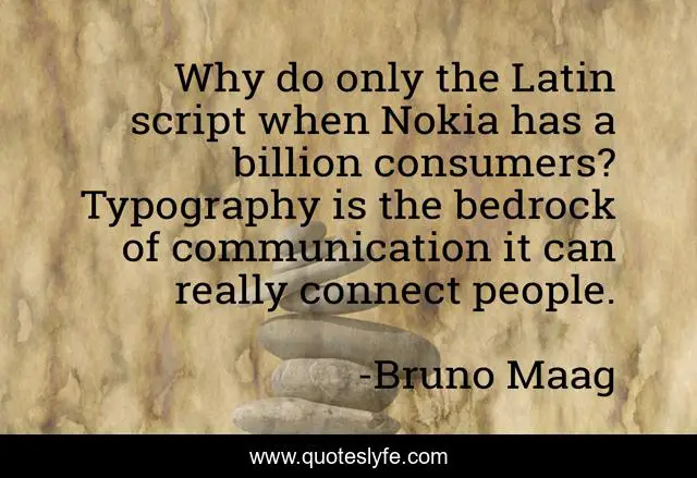 This page presents the quote "Why do only the Latin script when Nokia has a billion consumers? Typography is the bedrock of communication it can really connect people.". Author of this quote is Bruno Maag. This quote is about people, connect, why,.