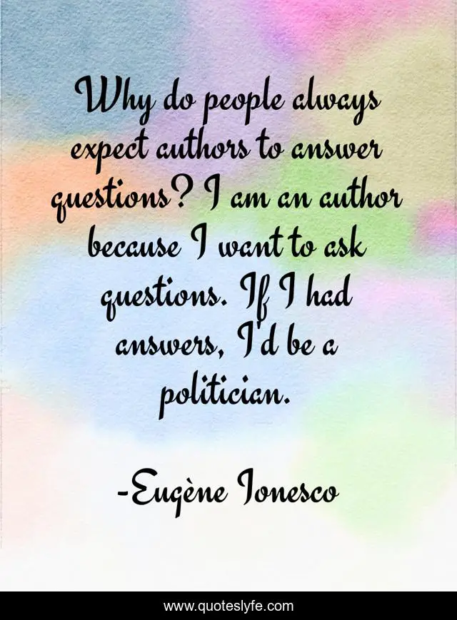 This page presents the quote "Why do people always expect authors to answer questions? I am an author because I want to ask questions. If I had answers, I'd be a politician.". Author of this quote is Eugène Ionesco. This quote is about writer, humor,.