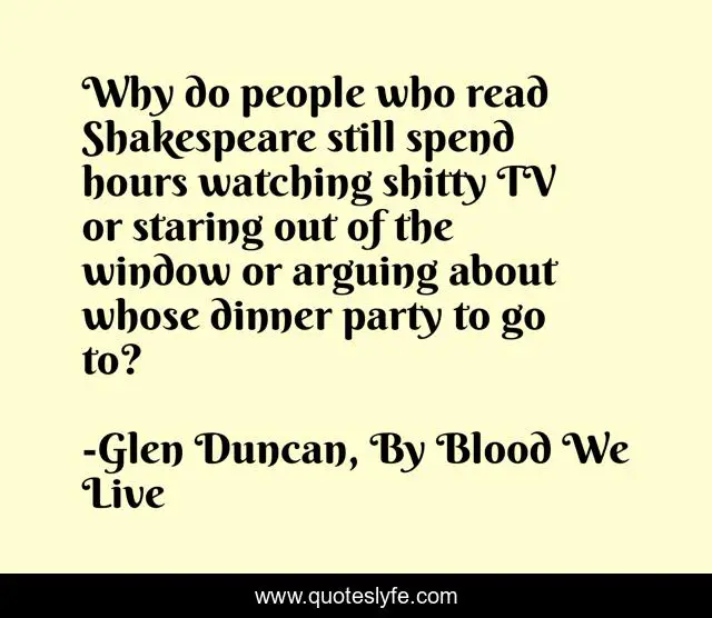 This page presents the quote "Why do people who read Shakespeare still spend hours watching shitty TV or staring out of the window or arguing about whose dinner party to go to?". Author of this quote is Glen Duncan, By Blood We Live. This quote is about tv, shakespeare,.