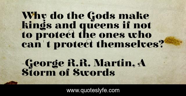 This page presents the quote "Why do the Gods make kings and queens if not to protect the ones who can't protect themselves?". Author of this quote is George R.R. Martin, A Storm of Swords. This quote is about gods, protect, protection, kings, queens,.
