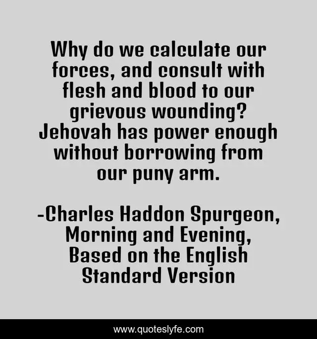 This page presents the quote "Why do we calculate our forces, and consult with flesh and blood to our grievous wounding? Jehovah has power enough without borrowing from our puny arm.". Author of this quote is Charles Haddon Spurgeon, Morning and Evening, Based on the English Standard Version. This quote is about faith, discipleship, sovereignty-of-god,.