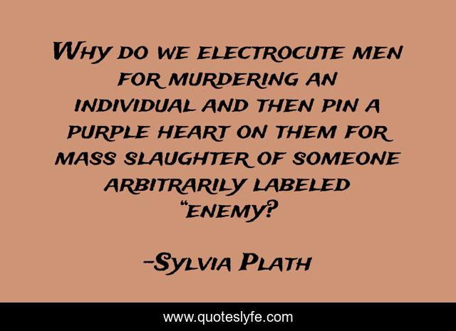 This page presents the quote "Why do we electrocute men for murdering an individual and then pin a purple heart on them for mass slaughter of someone arbitrarily labeled “enemy?". Author of this quote is Sylvia Plath. This quote is about murder, purple-heart, war,.