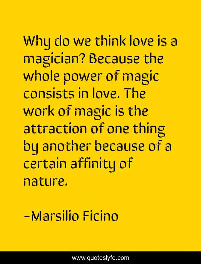 This page presents the quote "Why do we think love is a magician? Because the whole power of magic consists in love. The work of magic is the attraction of one thing by another because of a certain affinity of nature.". Author of this quote is Marsilio Ficino. This quote is about magic, love, spirituality, philosophy, renaissance, italy, affection,.