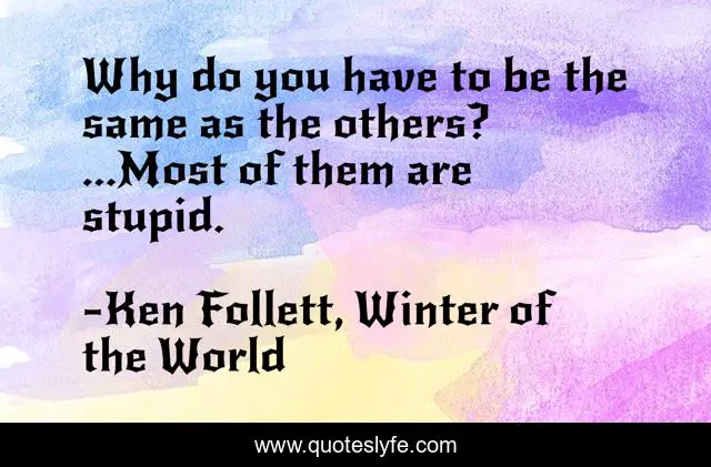 This page presents the quote "Why do you have to be the same as the others? ...Most of them are stupid.". Author of this quote is Ken Follett, Winter of the World. This quote is about sheep, human-nature, followers,.