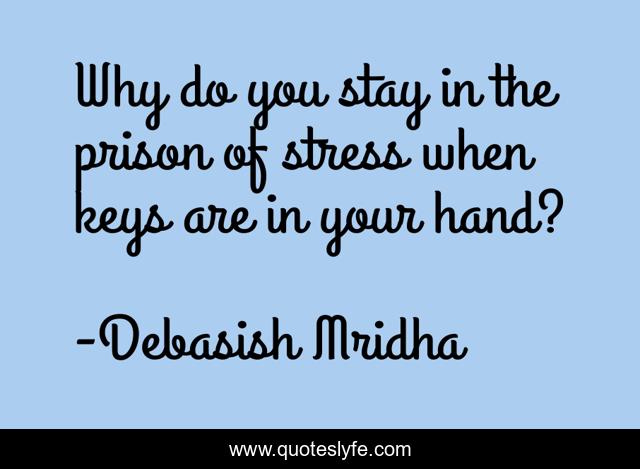 This page presents the quote "Why do you stay in the prison of stress when keys are in your hand?". Author of this quote is Debasish Mridha. This quote is about stress, how-to-deal-with-stress, philosophy, debasish-mridha, quotes, inspirational, enthusiasm, prison-of-stress, debasish-mridha-m-d,.