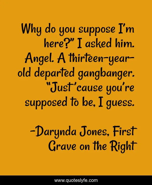 This page presents the quote "Why do you suppose I’m here?” I asked him. Angel. A thirteen-year-old departed gangbanger. “Just ’cause you’re supposed to be, I guess.". Author of this quote is Darynda Jones, First Grave on the Right. .