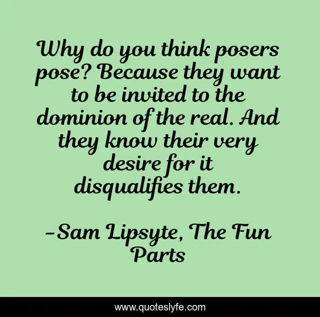 This page presents the quote "Why do you think posers pose? Because they want to be invited to the dominion of the real. And they know their very desire for it disqualifies them.". Author of this quote is Sam Lipsyte, The Fun Parts. This quote is about desire, posers, reality,.