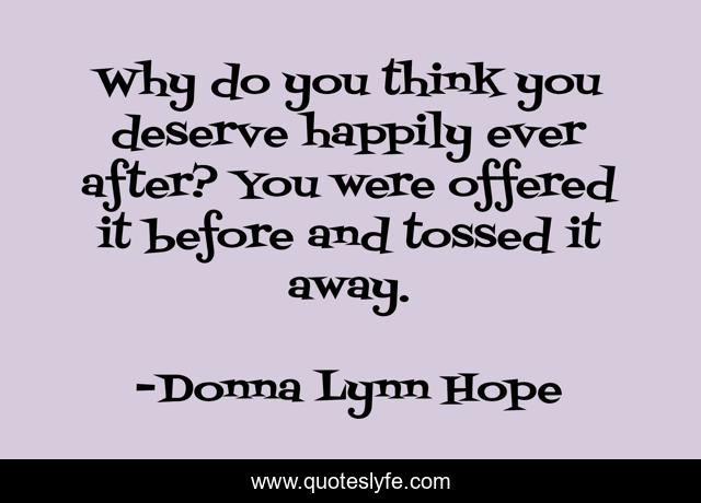 This page presents the quote "Why do you think you deserve happily ever after? You were offered it before and tossed it away.". Author of this quote is Donna Lynn Hope. This quote is about heartbroken, breakups, heartbreak, lost-love,.