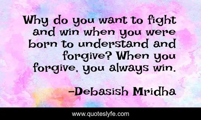 This page presents the quote "Why do you want to fight and win when you were born to understand and forgive? When you forgive, you always win.". Author of this quote is Debasish Mridha. This quote is about understand-and-forgive, forgiveness-wins, inspirational, philosophy, debasish-mridha, forgive, quotes, debasish-mridha-md, fight-and-win,.