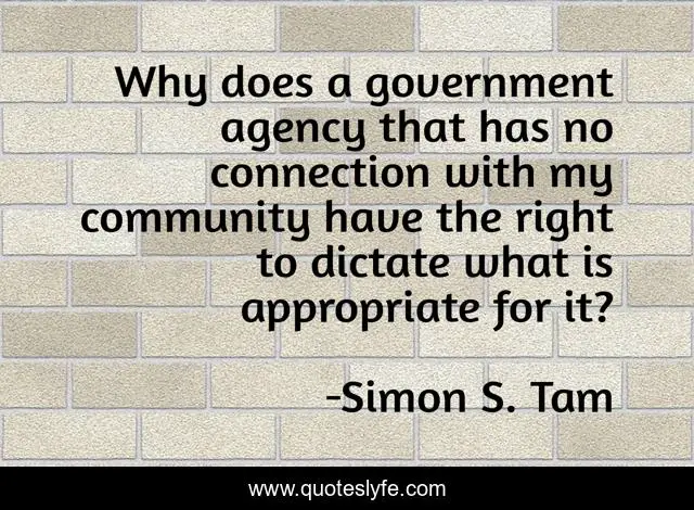 This page presents the quote "Why does a government agency that has no connection with my community have the right to dictate what is appropriate for it?". Author of this quote is Simon S. Tam. This quote is about systemic-racism, social-justice, government-corruption, racism, race,.