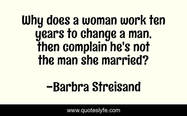 This page presents the quote "Why does a woman work ten years to change a man, then complain he's not the man she married?". Author of this quote is Barbra Streisand. This quote is about men-and-women, men, wives, husbands, marriage, women,.