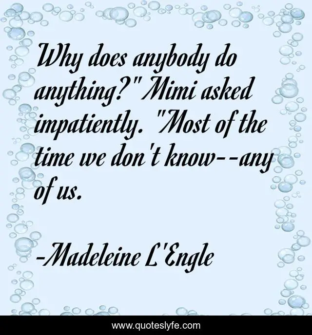 This page presents the quote "Why does anybody do anything?" Mimi asked impatiently. "Most of the time we don't know--any of us.". Author of this quote is Madeleine L'Engle. This quote is about action, a-winter-s-love,.