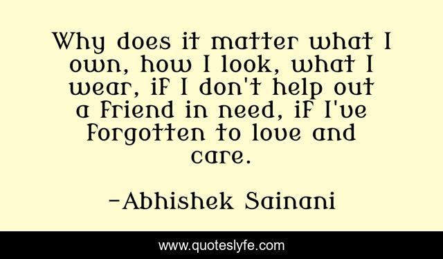 This page presents the quote "Why does it matter what I own, how I look, what I wear, if I don't help out a friend in need, if I've forgotten to love and care.". Author of this quote is Abhishek Sainani. This quote is about compassion, self-realization,.