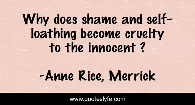 This page presents the quote "Why does shame and self-loathing become cruelty to the innocent ?". Author of this quote is Anne Rice, Merrick. This quote is about shame, self-loathing,.