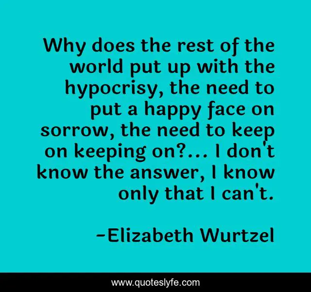 This page presents the quote "Why does the rest of the world put up with the hypocrisy, the need to put a happy face on sorrow, the need to keep on keeping on?... I don't know the answer, I know only that I can't.". Author of this quote is Elizabeth Wurtzel. This quote is about world, sorrow, happy,.