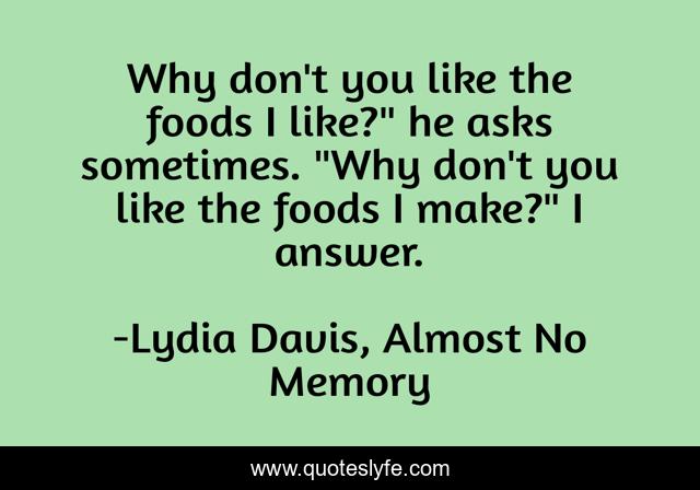 "Lydia Davis, Almost No Memory Quotes." Quoteslyfe.com, 2025. Mon. 08 Dec. 2025. <https://www.quoteslyfe.com/quote/Why-don-t-you-like-the-foods-168357>.