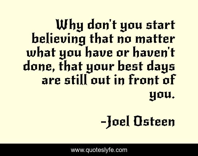 This page presents the quote "Why don't you start believing that no matter what you have or haven't done, that your best days are still out in front of you.". Author of this quote is Joel Osteen. This quote is about start, why,.