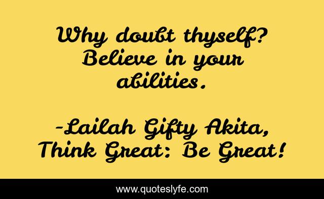 "Lailah Gifty Akita, Think Great: Be Great! Quotes." Quoteslyfe.com, 2025. Sat. 06 Dec. 2025. <https://www.quoteslyfe.com/quote/Why-doubt-thyself-Believe-in-your-abilities-125275>.