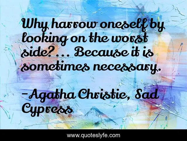 This page presents the quote "Why harrow oneself by looking on the worst side?... Because it is sometimes necessary.". Author of this quote is Agatha Christie, Sad Cypress. This quote is about life, pessimism, realism, reality,.