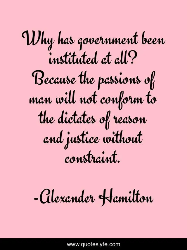 This page presents the quote "Why has government been instituted at all? Because the passions of man will not conform to the dictates of reason and justice without constraint.". Author of this quote is Alexander Hamilton. This quote is about government, justice, human-nature, human-beings, reason, passion, mankind, constraints,.