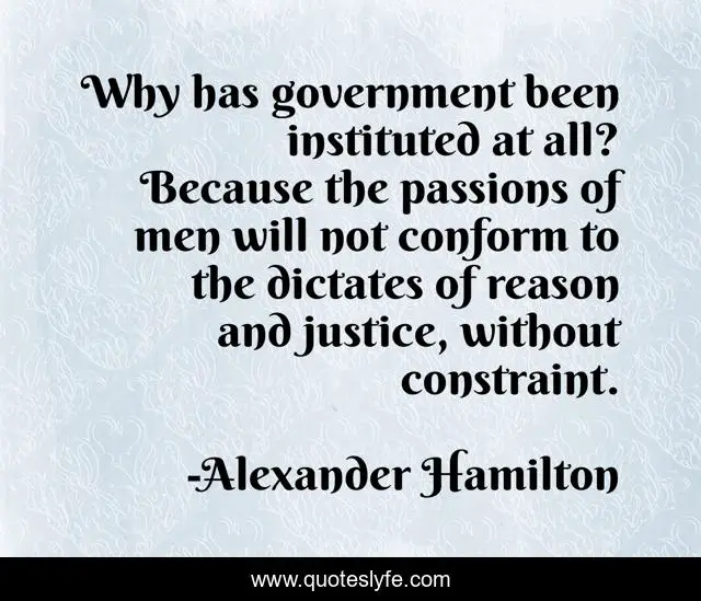 This page presents the quote "Why has government been instituted at all? Because the passions of men will not conform to the dictates of reason and justice, without constraint.". Author of this quote is Alexander Hamilton. This quote is about justice, men, why,.