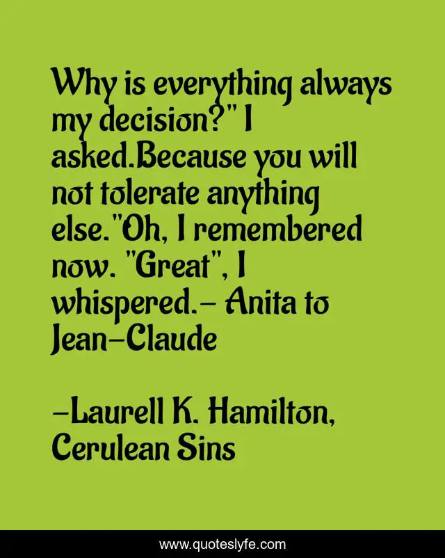 This page presents the quote "Why is everything always my decision?" I asked.Because you will not tolerate anything else."Oh, I remembered now. "Great", I whispered.- Anita to Jean-Claude". Author of this quote is Laurell K. Hamilton, Cerulean Sins. This quote is about anita-blake, hunter, paranormal, vampire, romance, jean-claude, fiction, anita,.