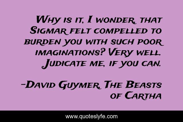 This page presents the quote "Why is it, I wonder, that Sigmar felt compelled to burden you with such poor imaginations? Very well. Judicate me, if you can.". Author of this quote is David Guymer, The Beasts of Cartha. This quote is about imagination, humor, warhammer, taunt,.