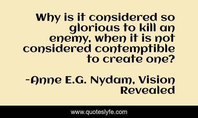 This page presents the quote "Why is it considered so glorious to kill an enemy, when it is not considered contemptible to create one?". Author of this quote is Anne E.G. Nydam, Vision Revealed. This quote is about peace, peace-making, enemies,.