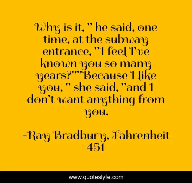 This page presents the quote "Why is it, " he said, one time, at the subway entrance, "I feel I've known you so many years?""Because I like you, " she said, "and I don't want anything from you.". Author of this quote is Ray Bradbury, Fahrenheit 451. This quote is about relationships, friendship,.
