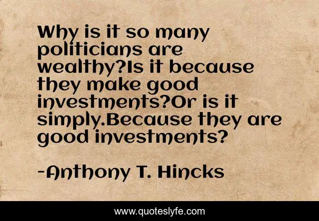This page presents the quote "Why is it so many politicians are wealthy?Is it because they make good investments?Or is it simply.Because they are good investments?". Author of this quote is Anthony T. Hincks. This quote is about wealth, money, philosophy, politicians, politics, investments,.