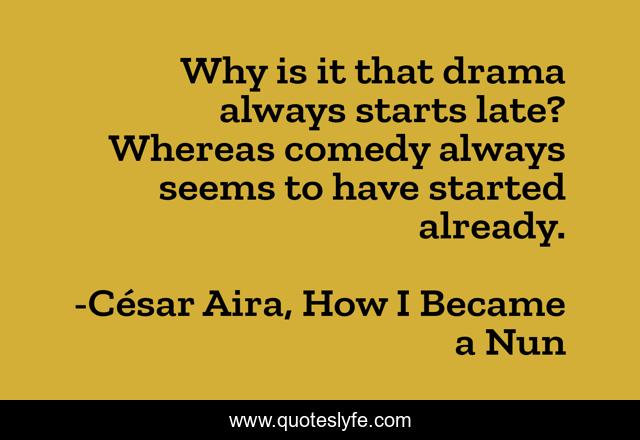 This page presents the quote "Why is it that drama always starts late? Whereas comedy always seems to have started already.". Author of this quote is César Aira, How I Became a Nun. This quote is about drama, comedy,.