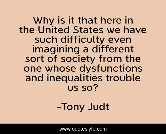 This page presents the quote "Why is it that here in the United States we have such difficulty even imagining a different sort of society from the one whose dysfunctions and inequalities trouble us so?". Author of this quote is Tony Judt. This quote is about difficulty, trouble, why,.
