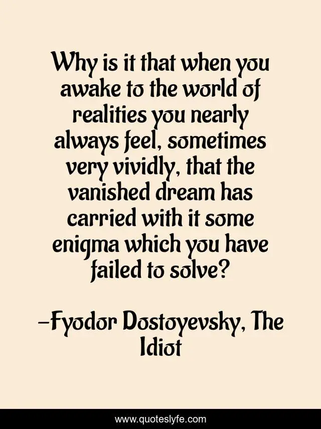 This page presents the quote "Why is it that when you awake to the world of realities you nearly always feel, sometimes very vividly, that the vanished dream has carried with it some enigma which you have failed to solve?". Author of this quote is Fyodor Dostoyevsky, The Idiot. This quote is about meaning, dreams, reality,.