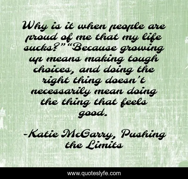 This page presents the quote "Why is it when people are proud of me that my life sucks?”“Because growing up means making tough choices, and doing the right thing doesn’t necessarily mean doing the thing that feels good.". Author of this quote is Katie McGarry, Pushing the Limits. This quote is about life, mrs-collins, sucks, noah-hutchins, growing-up, right-thing,.