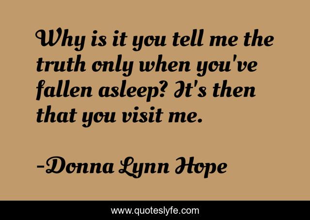 This page presents the quote "Why is it you tell me the truth only when you've fallen asleep? It's then that you visit me.". Author of this quote is Donna Lynn Hope. This quote is about psychic, dreams, lost-love, truth, dreaming,.